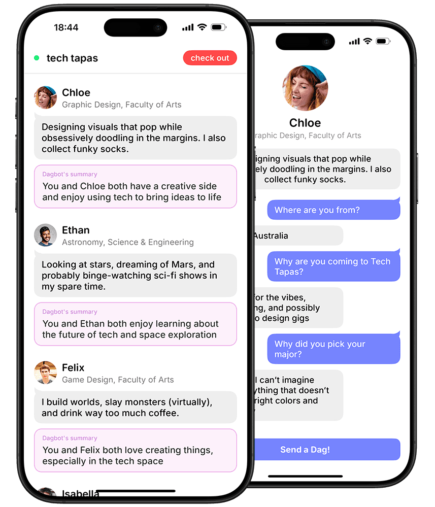 Dag is an offline networking app that allows you to quickly see who is attending an event, connect with them in one tap and skip the small talk with smart AI features that help you match up with interesting people.